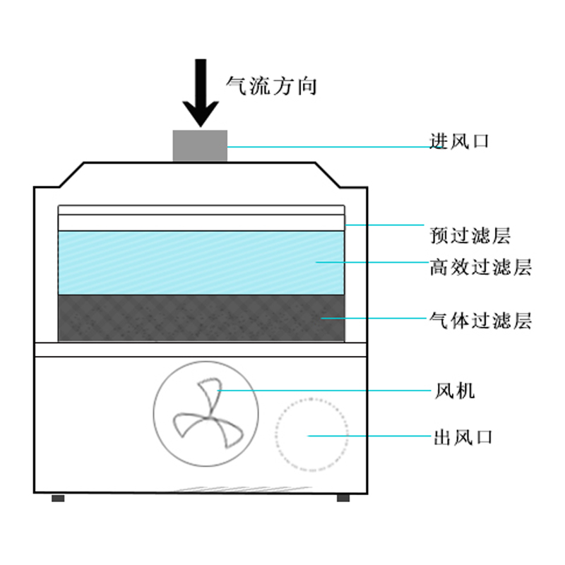 2.主過濾層過濾梯度設(shè)置:初中效過濾+HEPA高效過濾。凈化顆粒直